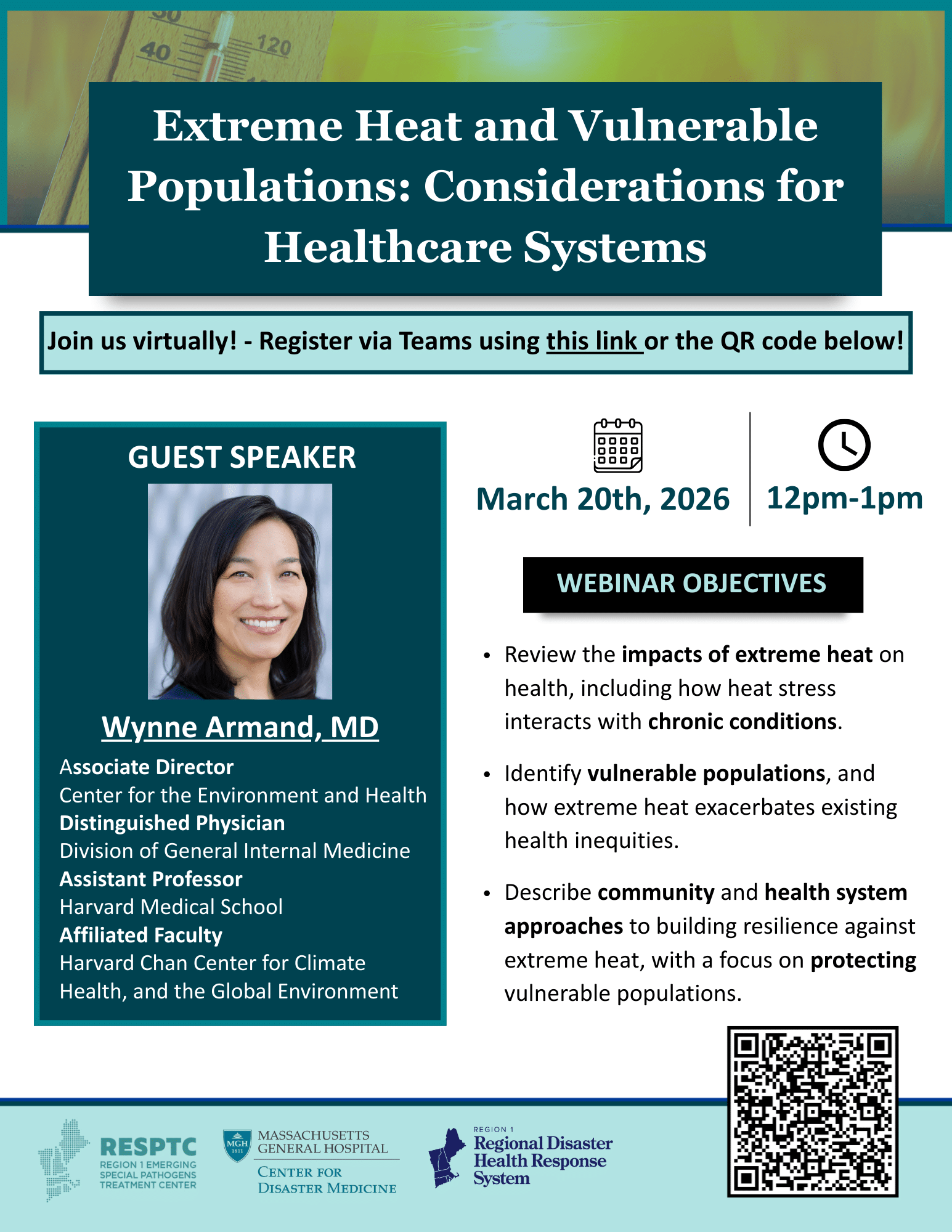 Greater Boston PSR Board Member Dr. Wynne Armand will discuss the health impacts of extreme heat, identify vulnerable populations, and share strategies for building resilience at both community and health system levels.