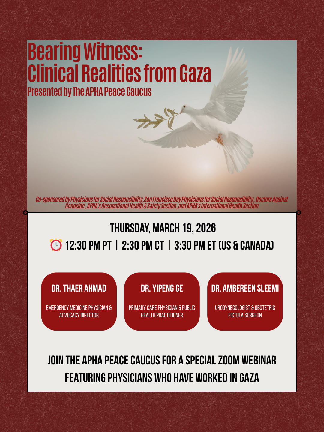 Join PSR and the APHA Peace Caucus for a special webinar featuring physicians who have worked in Gaza. Our speakers will share firsthand experiences, clinical insights, and reflections from providing care in a complex humanitarian setting.